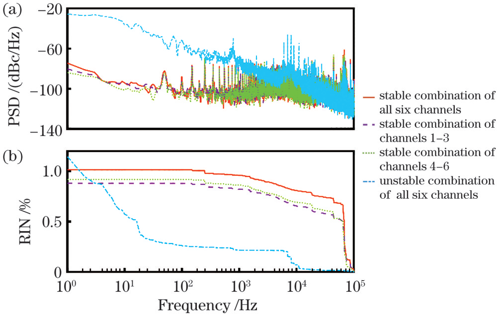 图3 合成光束的频谱噪声特性。(a)功率谱密度;(b)相对强度噪声