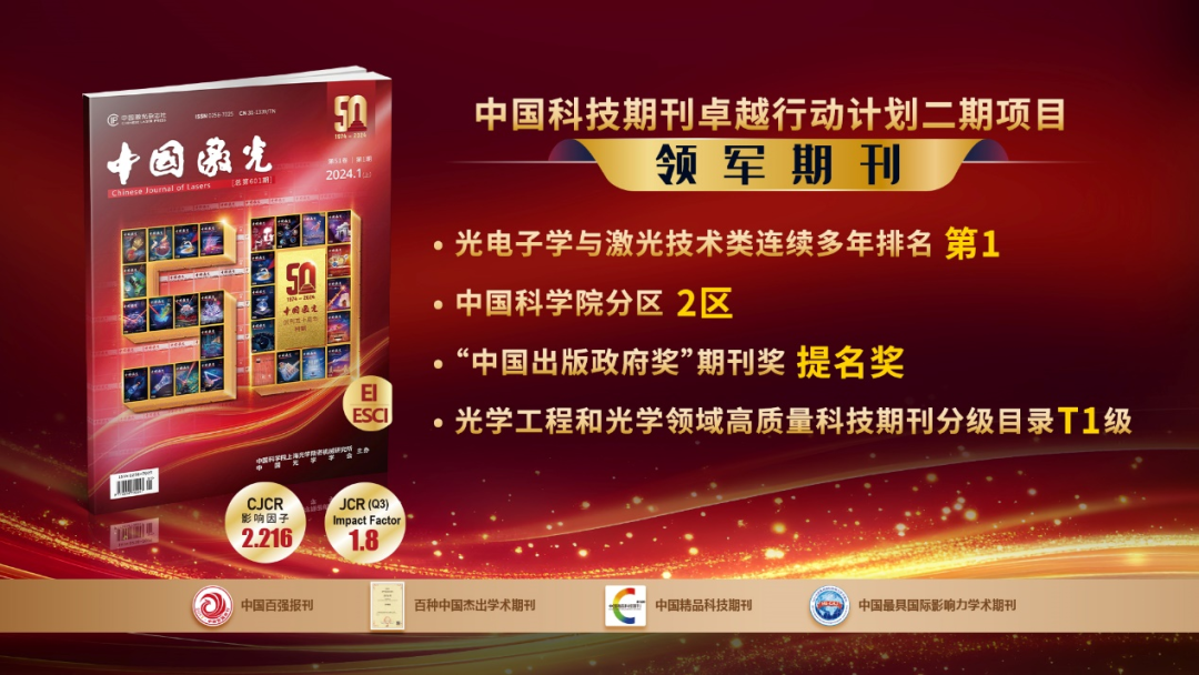 《中国激光》是全面报道激光技术领域最新研究成果的旗舰级中文学术期刊(半月刊)。目前被EI、ESCI、AJ、CA、INSPEC、Scopus、CSCD等收录,位列中国科学院期刊分区表2区。根据《中国科技期刊引证报告》显示,《中国激光》综合评价总分在本领域内连续多年排名第一。17次被评为“百种中国杰出学术期刊”(获得次数最多的光学期刊)、6次入选“中国精品科技期刊”、2次荣获“百强报刊”称号,并多次获得“中国最具国际影响力学术期刊”和“中国国际影响力优秀学术期刊”等荣誉。2021年荣获“第五届中国出版政府奖”期刊奖提名奖。2022年入选《光学工程和光学领域高质量科技期刊分级目录》“T1级”、《无机非金属材料领域高质量科技期刊分级目录》“T1级”。2024年入选中国科技期刊卓越行动计划项目——领军期刊。2025年中国科学院期刊分区表二区。