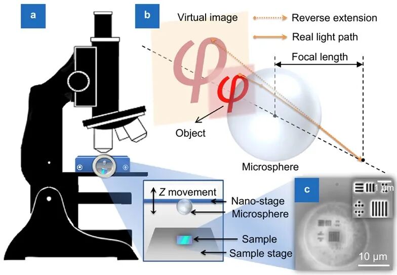 针对这一难题,由厦门大学洪明辉教授(曾任教于新加坡国立大学)带领的研究团队提出了远程模式微球辅助纳米级成像技术。相关成果以“Remote-mode microsphere nano-imaging: new boundaries for optical microscopes”为题,作为封面文章发表于Opto-Electronic Advances 2018年第1期(图1)。2018年该团队设计了一套集成光学控制系统(图2(a)),其核心是将一颗透明微球悬浮于样品表面,使其充当微型透镜。光线经微球表面折射后形成放大的虚像,再由传统显微镜的物镜捕捉。通过光路反向重构技术,可对虚像的位置和放大倍数进行精准标定(图2(b))。在实际成像实验中,搭载20 μm二氧化硅微球的油浸显微镜(100倍物镜,数值孔径1.4)能清晰分辨半导体测试样品的微观特征,成像结果与扫描电子显微镜图像高度吻合(图2(c))。