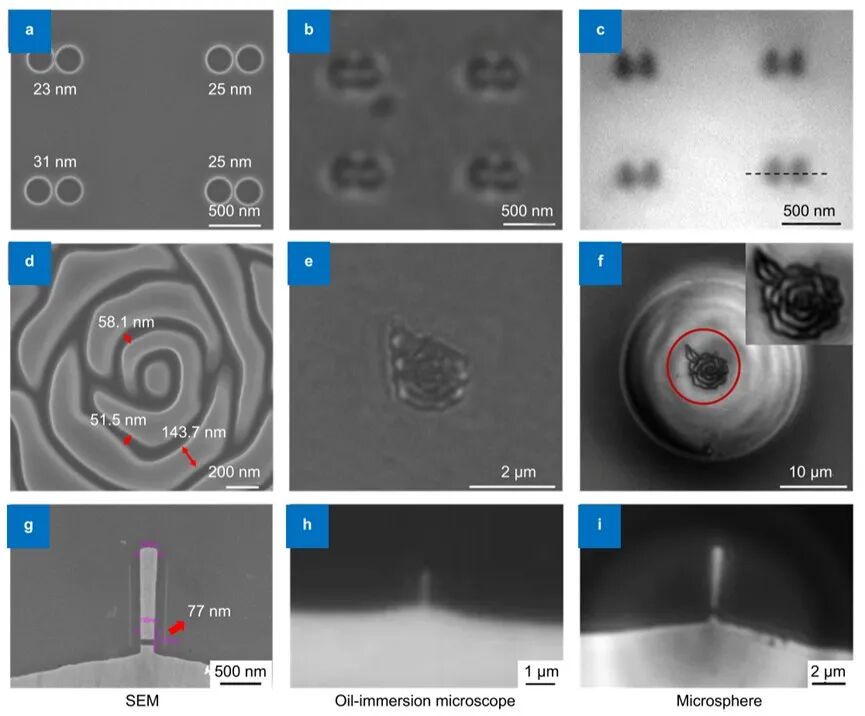 在分辨率测试中,该系统展现出了优异的纳米级成像性能。对于硅片上间隙为23~31 nm的纳米点阵列(图3(a)),传统油浸显微镜无法分辨相邻的纳米点(图3(b)),而20 μm微球则能清晰分辨出最小23 nm的间隙(图3(c))。同样,对于带有50~60 nm沟槽的复杂 “纳米玫瑰” 结构(图3(d)),传统显微镜的成像结果模糊不清(图3(e)),27 μm微球却能清晰呈现其纳米级纹理细节(图3(f))。值得关注的是,针对生产线硬盘磁头中77 nm的金属探针间隙(图3(g)),该系统实现了清晰、实时、非接触的成像(图3(i)),这是传统油浸显微镜难以完成的任务(图3(h))。