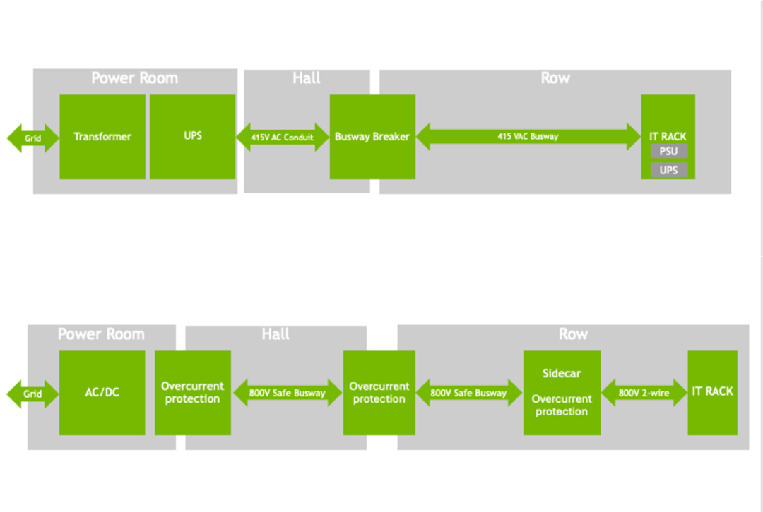 图丨当前数据中心供电架构(上)与 NVIDIA 800 VDC 架构对比(下)(来源:NVIDIA)