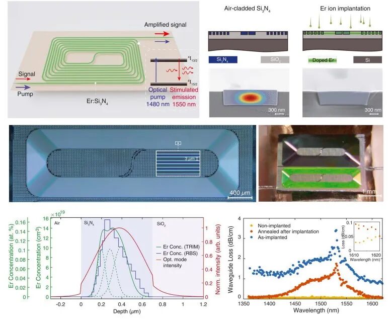 在众多基质材料中,Si3N4因其出色的CMOS工艺兼容性、宽透明窗口和通信波段的极低损耗,被视为理想的无源平台,适于构建大规模光波导网络。然而,Si3N4对Er3+等稀土离子的固溶度较低,常规工艺难以实现高浓度、高质量的掺杂。为突破这一瓶颈,研究人员采用大马士革工艺结合高能铒离子注入技术进行Er:Si3N4波导制备,如图1所示。该方法能够精确地将铒离子注入到氮化硅波导,使铒离子在波导中呈高斯分布,并在此基础上成功实现超过30 dB的片上净增益及145 mW的连续光输出功率。这项突破标志着高性能放大功能首次被集成到标准、低损耗的无源氮化硅波导回路中,为在大型硅基光电子芯片中直接制备“片上光源”与“片上放大”扫清了关键障碍。