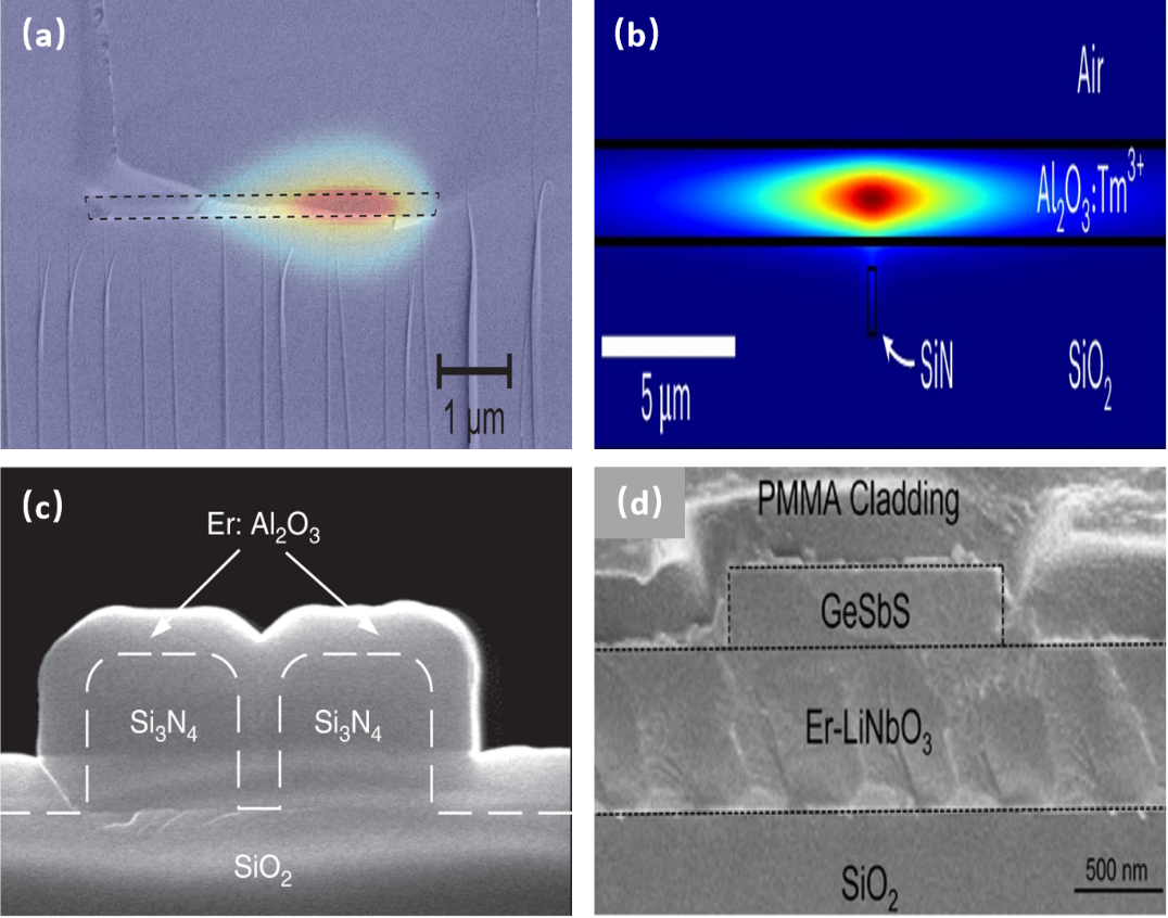 除材料选择外,波导结构的设计对降低传输损耗、增强光-物质相互作用至关重要。文章系统分析了多种适用于EDWA/EYCDWA的创新波导结构。低限制结构通过采用更薄、更宽的波导芯层,显著降低侧壁散射损耗。在Si3N4平台上,基于200 nm厚的低限制波导,研究人员在17 cm波导上实现了15 dB的净增益及C波段可调谐激光输出。大模场结构借鉴光纤放大器(EDFA)中的设计理念,可支持更高泵浦功率,激活更多稀土离子。研究者在Er:TFLN平台上采用该结构实现了113 mW的输出功率,在掺铥氧化铝(Tm:Al2O3)平台上实现了W级的片上输出功率。狭缝结构能将光场紧密限制在低折射率的狭缝增益区内,极大增强光与增益介质的相互作用。基于原子层沉积技术(ALD)将Er:Al2O3填充入Si3N4狭缝波导,研究者实现了20.1 dB/cm的高单位净增益,展示了其在紧凑型高增益放大器中的潜力。无刻蚀增益介质结构通过刻蚀非掺杂的无源波导来引导光场,避免直接刻蚀增益介质。无论是基于氧化物还是硫系材料的无刻蚀增益介质设计,均有效降低了波导的传输损耗。图4 (a-d) 分别展示了所述低限制波导、大模场波导、狭缝波导、无刻蚀增益介质波导四种结构。