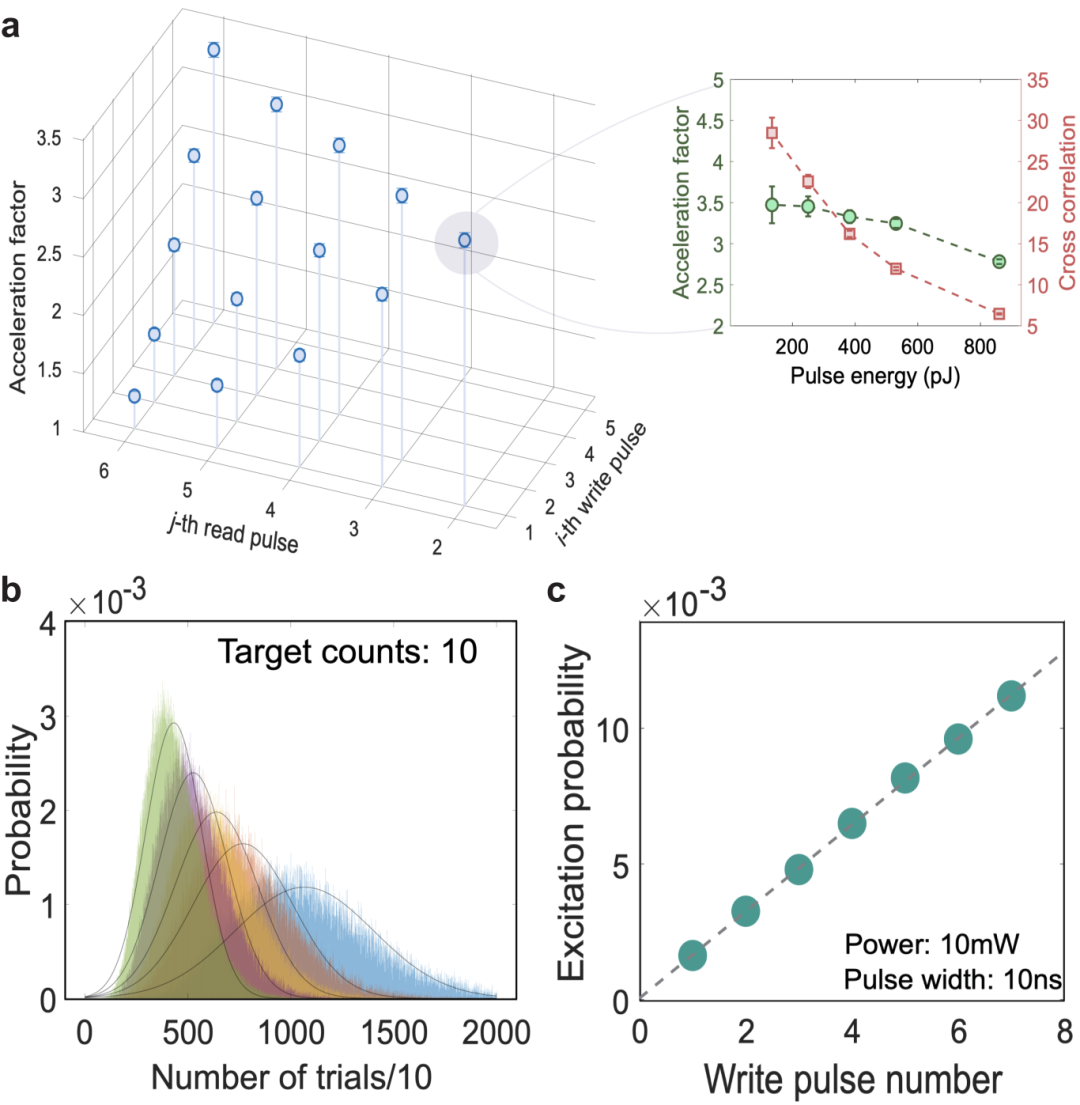 值得关注的是,该系统在极低效率条件下仍展现出显著的量子增强特性。尽管量子存储的读取效率仅为0.3%,但基于量子关联的光子对符合概率显著高于随机符合概率,实现了约3倍的加速因子,如图2a所示。这种非经典关联使得在相同脉冲能量下,计算速度获得实质性提升,突破了传统随机计算依赖提高脉冲能量来提升速度的局限。