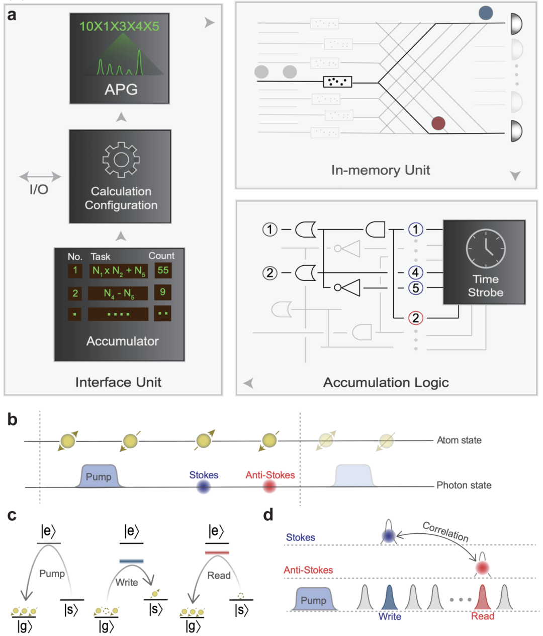图1:基于量子存储的量子存内处理器工作原理。a计算流程示意图,展示从任务输入到结果输出的完整过程。b光子与原子激发的时间序列。c量子存储器内部的物理操作(泵浦-写入-读取)。d基于关联光子对的乘法运算示意图。该系统将任务编码为光子产生概率,并通过累积计数解码结果