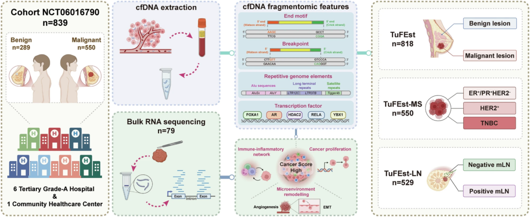 图 | 乳腺癌筛查中 cfDNA 片段组学分析的研究设计和队列特征(来源:上述论文)
