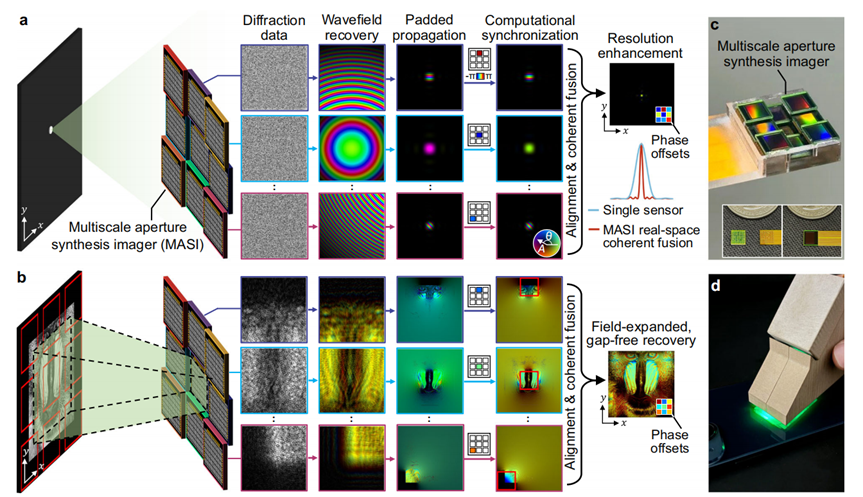 MASI 的原理说起来有点反常识:光从物体表面弹出来之后在空中自由传播,本来应该越散越开、越变越模糊。但 MASI 恰恰利用了这种扩散,散开的光波里藏着物体的完整信息,只要有足够的算力把它还原回来,模糊反而成了优势。九块小芯片各自捕捉一小部分散开的光,经过计算相位同步后,将各个芯片恢复的复波场在物平面相干叠加,得到高分辨率重建。
