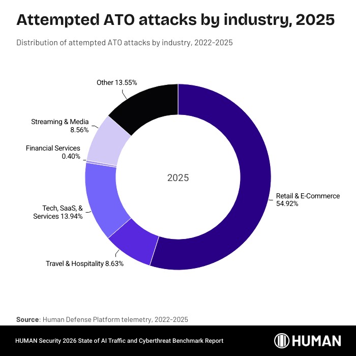 图丨2025 年各行业尝试账户接管 (ATO) 攻击的百分比(来源:HUMAN Security)