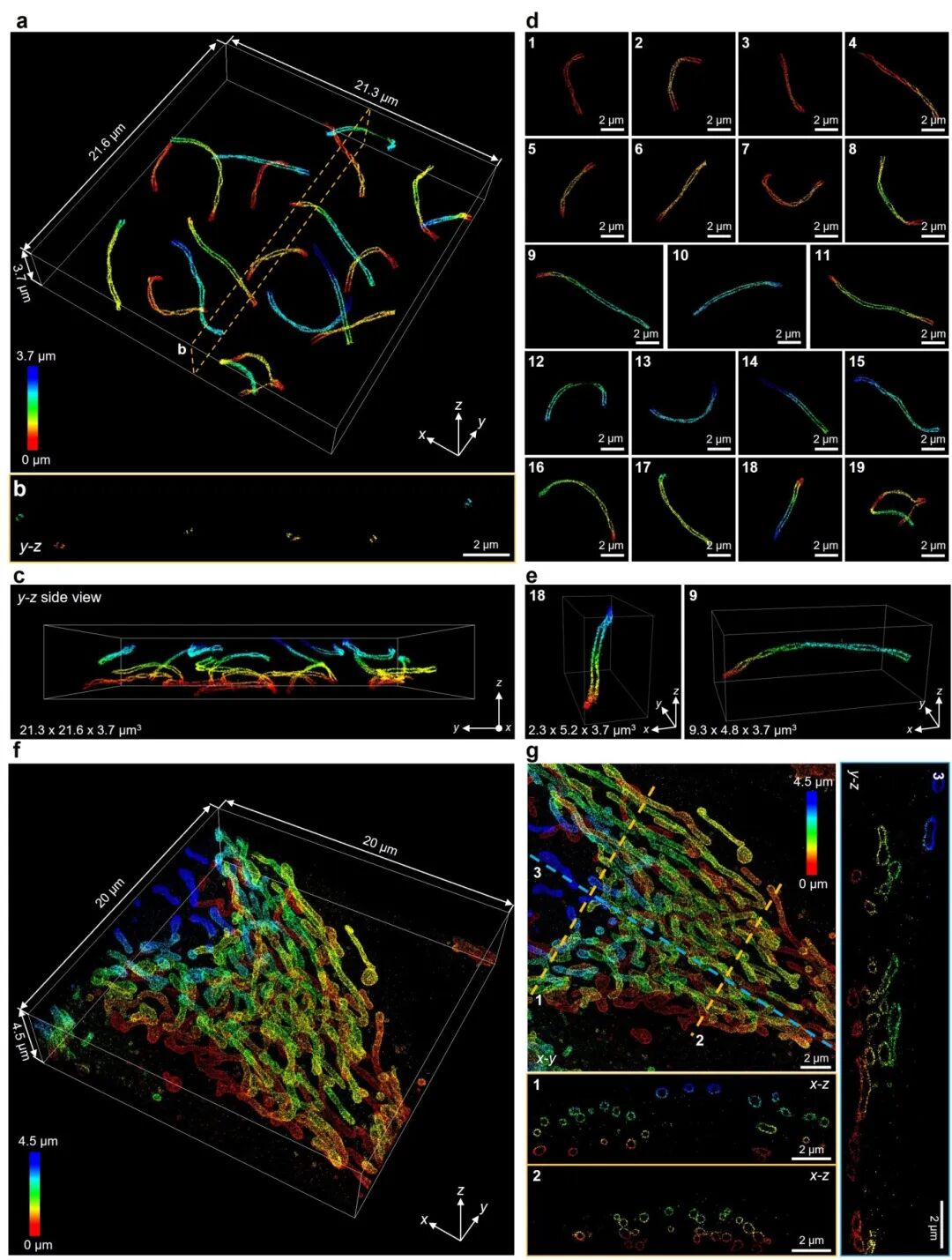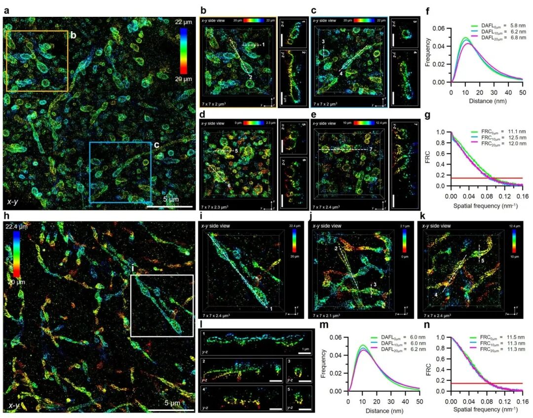 me4Pi-SMLM通过柱面镜引入像散以消除轴向相位模糊,使其适用于较厚样本的成像。为展示全细胞成像能力,研究对小鼠精母细胞核中联会复合体(SC)的支架蛋白SYCP3进行了成像。me4Pi-SMLM在整个细胞核范围内,在各个空间朝向与深度上均清晰揭示了SC的双螺旋特征(图4a-e)。此外,对深度达4.5微米的全细胞线粒体外膜网络进行成像,清晰分辨了线粒体膜轮廓与复杂互连结构(图4f-g)。定量分析确认,在整个成像体积内me4Pi-SMLM保持了3–5纳米的DAFL定位精度与10–15纳米的FRC分辨率。