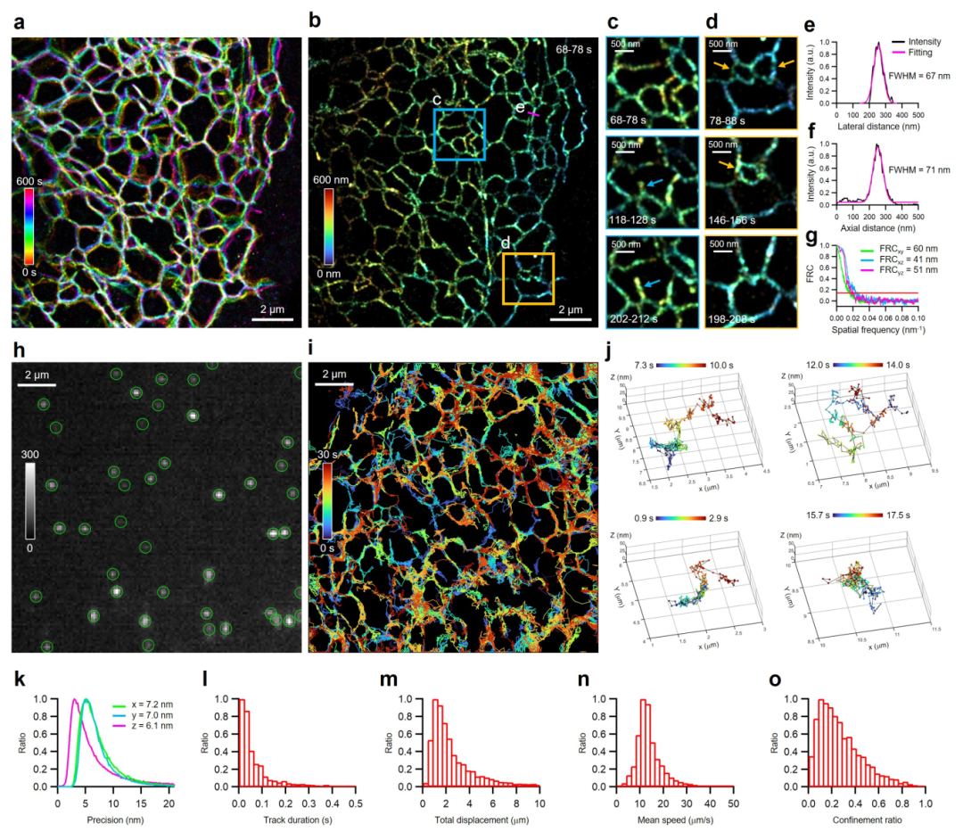 传统4Pi-SMLM因系统复杂度高、稳定性要求严苛,一直未能实现活细胞成像。me4Pi-SMLM凭借简化的光路、增强的稳定性及对标准共聚焦培养皿的兼容性,首次将4Pi级精度应用于活细胞成像。研究以染料PA-JF549-HaloTag标记U-2 OS细胞系内质网结构,以9毫秒周期时间进行me4Pi-SMLM成像,连续采集10分钟捕捉内质网动态变化。结果以三维40–60纳米的分辨率清晰呈现了细胞外周内质网管状网络的动态过程。研究进一步将me4Pi-SMLM应用于三维单分子追踪,使用更低染料浓度和脉冲激活维持适宜的Sec61β单分子密度(图5h)。以三维6纳米定位精度与9毫秒时间分辨率,揭示了局限于内质网膜内、具有不同迁移率的Sec61β单分子活动。