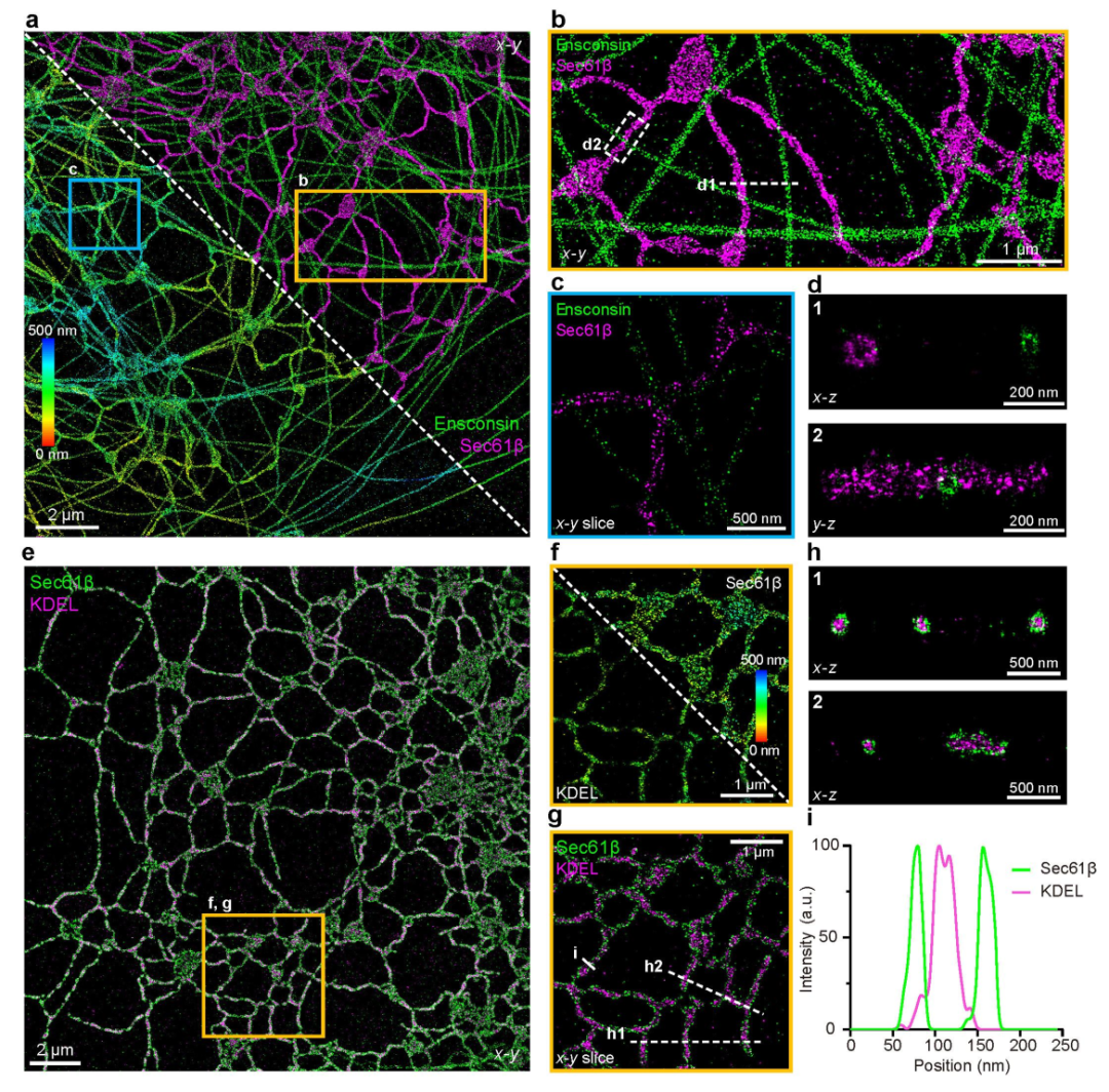 为研究细胞器间的空间互作,多色成像能力至关重要。本研究在me4Pi-SMLM上集成了此前开发的回收荧光(Salvaged Fluorescence)分色技术。同时,为最大程度降低背景,研究进一步改进了Fluorogenic DNA-PAINT技术,并结合纳米抗体进行样品标记。利用单一552纳米激光同时激发AF568/Cy3B或ATTO Rho 11/Cy3B两组染料对,通过光谱分色实现双通道同步采集。采用该策略,me4Pi-SMLM对细胞中的微管与内质网进行双色标记成像(图3a-b),实现了清晰的光谱分离,串扰极低,横向和轴向均清晰分辨了内质网与微管的中空结构(图3c-d)。对内质网膜(Sec61β)与腔(KDEL)进行双色成像(图3e),高分辨率有效区分了这两个紧密相邻的腔室,清晰解析了内质网的不同亚结构(图3f-i)。
