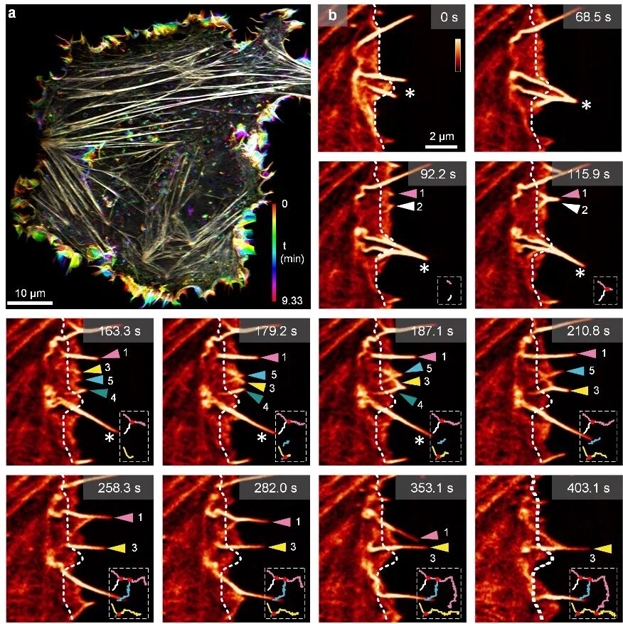 活细胞中肌动蛋白的超分辨成像一直颇具挑战,传统方法难以将微弱的肌动蛋白信号与噪声分离。得益于其超高的图像质量,DaMo成功实现了对U2OS活细胞中肌动蛋白的时序记录,首次观察到丝状伪足延伸并级联融合的动态过程。这些结果充分展现了DaMo解析关键细胞过程中肌动蛋白时空动态的能力。此外,DaMo还具有较低的光毒性,在连续拍摄千余帧后细胞仍能保持活性。
