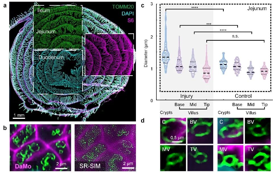 组织切片的背景噪声更强,整体空间异质性更复杂,对传统超分辨成像技术构成了较大挑战。而DaMo凭借其高质量、高通量的特性,有效突破了这一瓶颈。该工作展示了DaMo对10毫米见方小鼠小肠完整冰冻切片的三通道超分辨成像结果,实现了1.92 TB原始数据的高效采集与在线重建。在此基础上,该工作还对小鼠小肠炎症模型下不同肠段、不同部位的线粒体病变进行了定量统计与分析,充分展现了DaMo在组织水平实现跨尺度、高保真超分辨成像的独特优势。