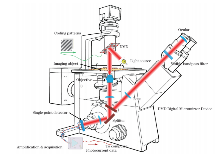 显微成像技术是观测微观世界、研究生物组织结构的关键手段。然而,传统的面阵列探测器(如CCD或CMOS相机)面临着波段局限与成本压力,即硅基探测器在可见光波段表现优异,但在近红外波段响应效率极低;若采用高性能的近红外二区面阵相机,其高昂的造价又使得相关技术难以普及。此外,在单一系统中实现多波段成像通常需要复杂的光路切换,易引入机械误差。单像素成像(SPI)技术凭借单点探测器即可实现二维成像的独特性,不仅显著降低了硬件成本,更利用其极宽的光谱响应特性,为低成本、跨波段的显微探测提供了全新的解决思路。