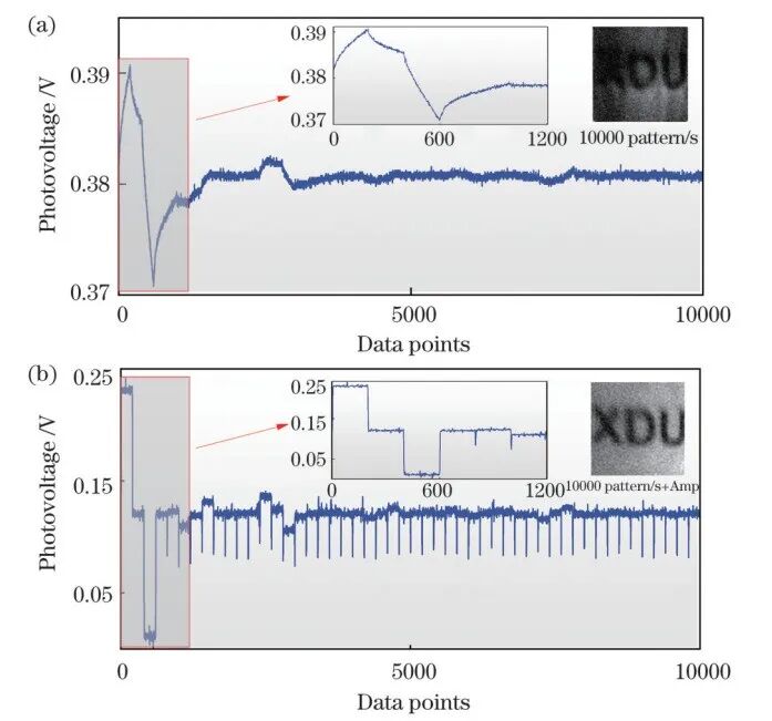 为了确保成像的准确性,研究团队首先对核心探测元件进行了性能表征。如图2所示,硅探测器与铟镓砷探测器在各自波段内均表现出良好的线性光电响应,但其响应带宽的限制在高速采样下会引发信号滞后。鉴于此,团队在探测器后端引入了高性能信号放大器。如图3所示,在10000 pattern/s 的高投影速率下,引入放大器前的畸变信号被修正为锐利的“方波”特性。这一优化显著提升了系统对光强变化的瞬态跟随能力,为高速、高质量成像奠定了物理基础。