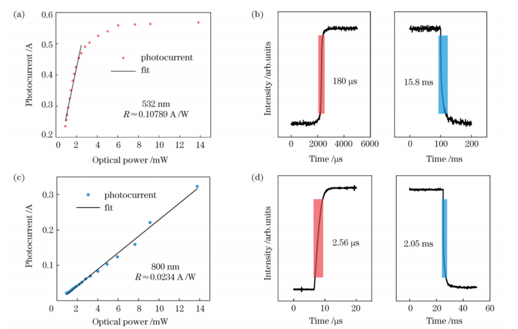 图2 硅探测器与近红外铟镓砷探测器的光电响应及响应时间表征