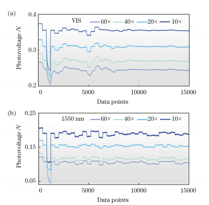 图4 不同放大倍率(10×、20×、40×和60×)物镜对应的采集信号强度对比