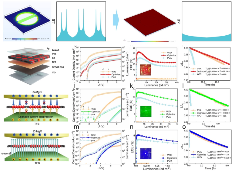 在器件物理层面,团队系统揭示:亚微米限域结构中电场非均匀分布是性能退化的关键根源。研究发现,像素边缘存在显著电场集中效应,会引发电流拥挤、非辐射复合增强及局部热积累,从而限制器件效率与寿命。针对这一机制,团队提出介电匹配策略:通过在电荷阻挡层引入TiO₂纳米颗粒,调控材料介电常数,使其与发光层匹配,从而实现电场均匀化。通过系统实验验证,明确建立了:介电匹配 → 电场均匀化 → 性能提升 的因果关系。在此基础上,红光QLED在12,700 PPI下实现:EQE:26.1%,寿命:65,190小时,绿光与蓝光效率分别提升124%和119%。