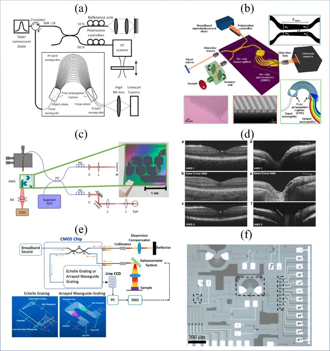 图2 基于AWG或者光谱仪的SD-OCT系统示意图。(a) 基于片上AWG的SD-OCT实验系统示意图。(b) 基于片上AWG和分束器的SD-OCT系统示意图。(c) 基于片上AWG的SD-OCT系统示意图。(d) 基于片上AWG的OCT系统与商用OCT系统Zeiss Cirrus 4000眼睛断层成像的对比,其中子图a、d图像为使用AWG1在34kHz下获取;子图c、f图像为使用AWG2在20 kHz下获取;子图b、e图像为使用Zeiss Cirrus 4000获取。(e) 基于片上分束器和AWG或Echelle Grating的SD-OCT示意图。(f) 基于片上微环、AWG和光电探测器阵列的光谱仪显微镜图像。