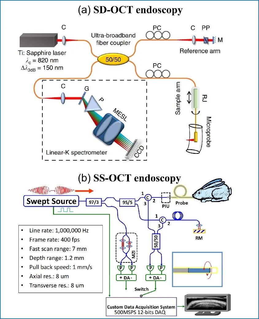 图1 FD-OCT 系统示意图。(a) SD-OCT endoscopy。(b) SS-OCT endoscopy。