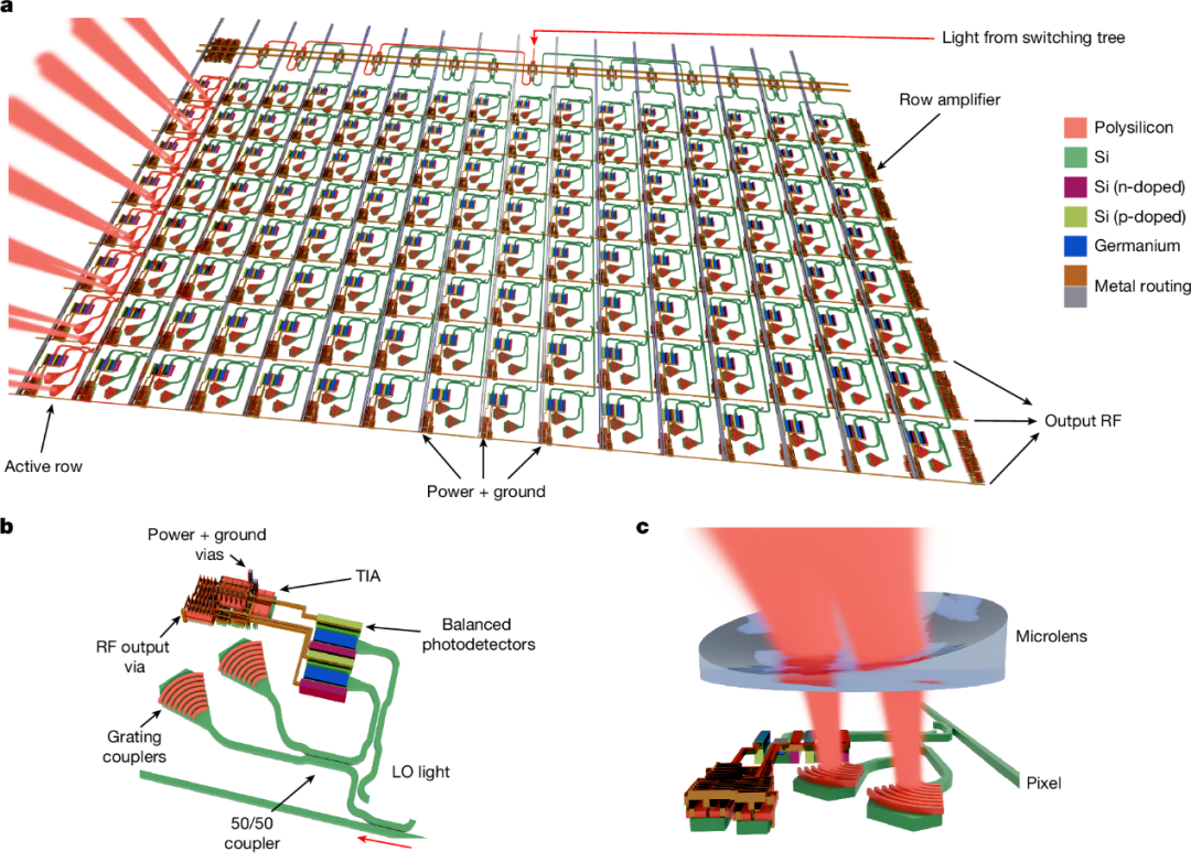 片上集成架构示意:(a)单像素块结构总览;(b)单像素中的单站光路;(c)沉积微透镜结构改善单像素出光收光。(来源:https://www.nature.com/articles/s41586-026-10183-6/figures/2)