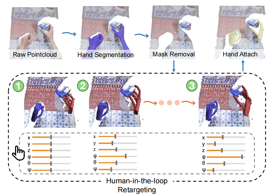 因此,带有三维深度信息的视频数据仅通过第一人称视角即可完成大量操作。同时,三维信息在 human-in-the-loop retargeting 时可辅助更精准的空间位置判断,从而提高转换数据的质量。
