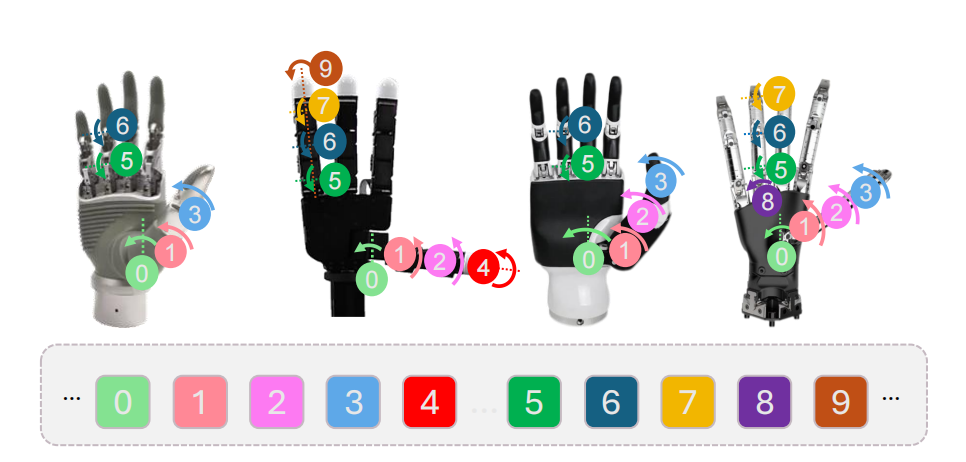 数据构建完成,接下来研究人员解决的问题是训练模型。他们提出了一套统一动作空间 FAAS(Function-Actuator-Aligned Space)策略,核心思路是:将功能相同的关节映射到动作空间的同一维度,从而能够让不同灵巧手的控制具有一定的功能语义性,以在不同的灵巧手之间更好地进行策略迁移和统一。