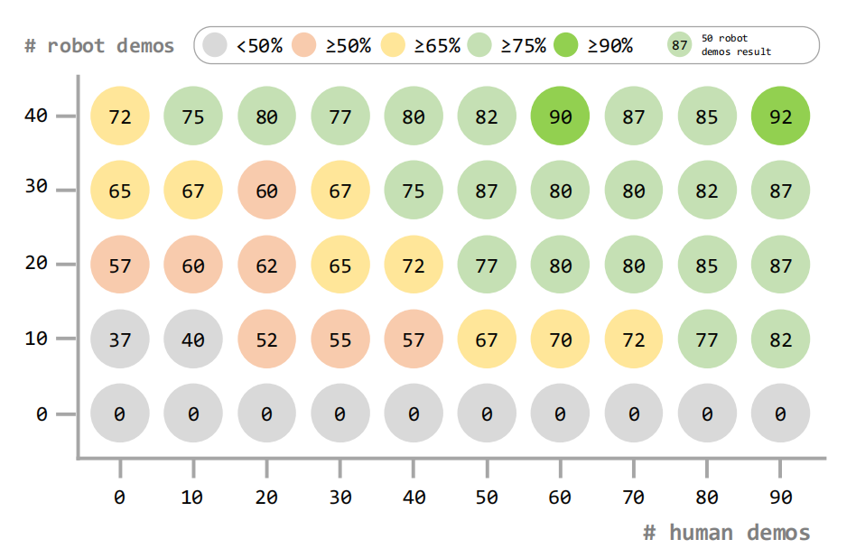 图丨人机协同训练。任务平均进度与转化后的人类示范样本及机器人示范样本数量的关系。颜色表示不同性能区间(绿色:与仅使用 50 个机器人样本的结果相当),每个数据点代表 20 次试验的平均值(来源:arXiv)