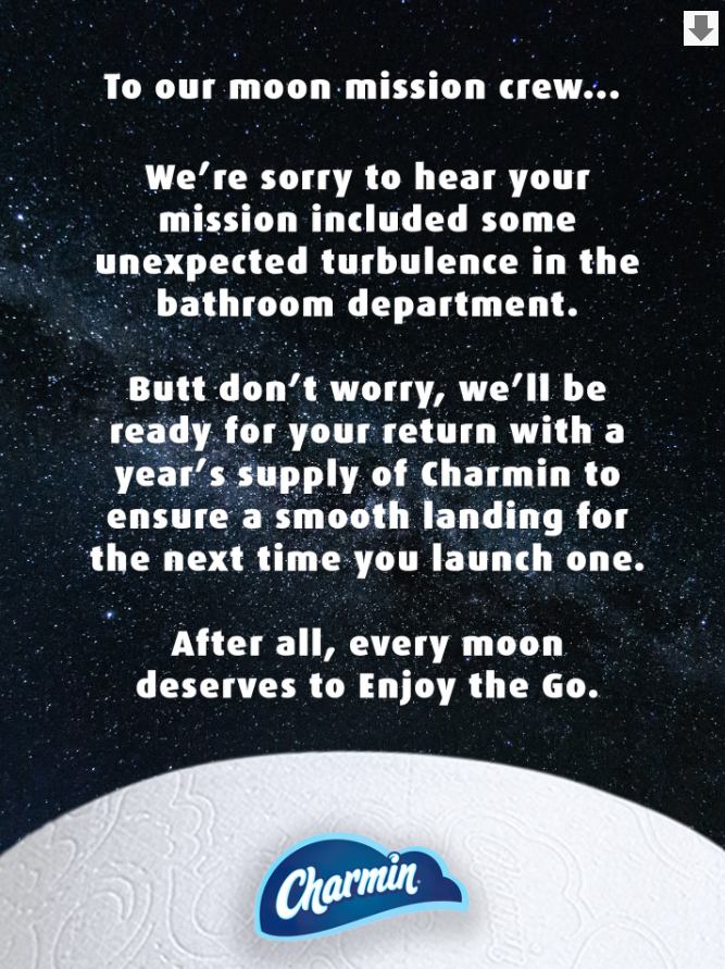 “致我们的绕月任务机组……听说你们在‘卫浴部门’遭遇了一些意料之外的‘颠簸’,我们深表同情,”Charmin 写道,“但(腚)别担心,我们已经为各位凯旋准备了一整年的 Charmin 纸巾,保准让你们下次‘发射’时能有个顺滑的着陆。毕竟,每一轮‘明月’都值得享有舒心的排遣。”