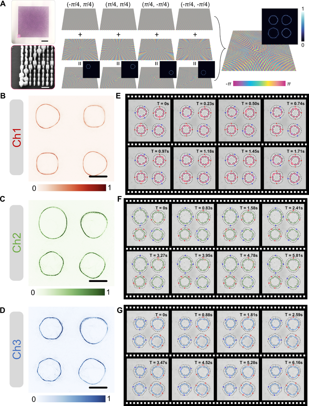 除纵向光场演变外,研究团队进一步实现了横向平面内的光学扳手阵列。图4展示了该功能的设计与实验结果。其中图4A左侧为阵列化超表面的光学显微照片与扫描电镜图像;右侧为相位分布设计原理:通过对每个多边形涡旋叠加特定的偏折相位,可在焦平面上将多个光场分开,形成2×2阵列。