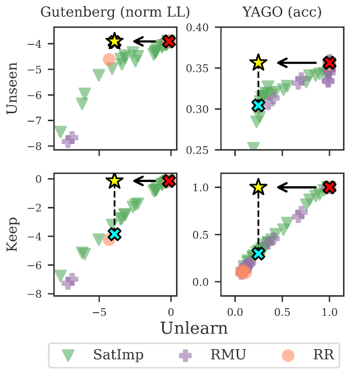 有了 Hubble,研究人员决定让三种算法站上擂台,“真刀真枪”地比一比:在包含版权诱饵和隐私诱饵的 8B 参数、500B Token 扰动模型上进行测试,不仅需要精确抹除应当被遗忘的“Unlearn 集”,还要尽可能保留与之相邻的“Keep 集”和通用能力。