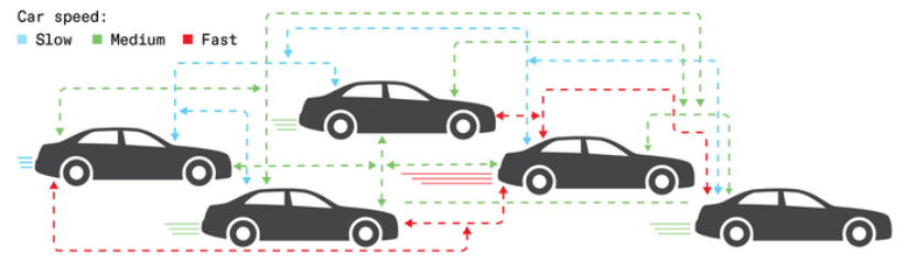 图丨一次传输即可呈现完整信息:一辆车慢速行驶;三辆车中速行驶;一辆车快速行驶。系统立即识别出大多数车辆的行驶状况,无需共享或处理任何单个车辆的数据(来源:IEEE)