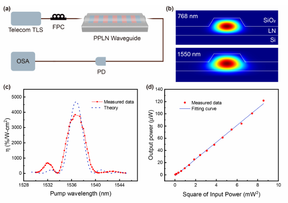 薄膜铌酸锂(TFLN)凭借宽透明窗口与卓越的非线性特性,成为构建集成量子光子系统的理想平台。中国科学技术大学郭光灿院士团队任希峰、冯兰天等基于周期性极化薄膜铌酸锂(PPLN)波导,成功在芯片上实现了高质量双光子及四光子量子态的制备。实验显示,该波导的二阶非线性转换效率高达3840%/W·cm2;在连续波泵浦下,双光子对产生率(PGR)达 7.5 MHz/μW,且带宽超过60 nm。此外,研究团队进一步利用飞秒脉冲泵浦实现了产生率为3.5 Hz的四光子态生成,完成了集成化多光子源的原理性验证。相关成果发表于Chinese Optics Letters 。