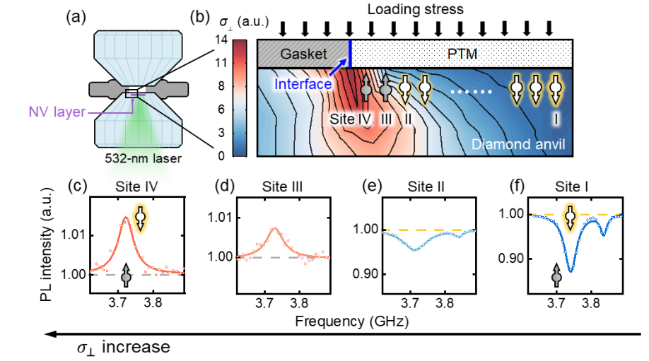 金刚石NV色心因其与金刚石对顶砧的高度兼容性,以及纳米尺度的磁探测能力,成为近年来高压原位表征的重要工具。中国科学技术大学王亚等首次通过实验揭示了应变对自旋-光学动力学的调控机制,并基于该机制在纳米尺度实现了自旋极化反转。研究发现,强对称性破缺应变像一双“无形的手”,从两个方向协同“拧动” 自旋极化的方向:1)激发态自旋混合:应变抑制激发态上系间窜越(ISC)过程的自旋选择性,相当于松开了自旋极化的“原有固定”;2)单重态跃迁分支改变:应变显著改变单重态回到基态的下ISC跃迁分支比,使系统更倾向于向极化反转状态布居,相当于为自旋极化“重新定向”。两个效应协同作用,最终使NV色心光泵浦后实现自旋极化的反转。相关成果发表于Physical Review Letters 。