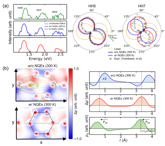 原子核量子效应包含核的零点振动与量子隧穿,对材料晶格稳定性、量子顺电性乃至超导等现象具有决定性影响。中国科学院物理研究所孟胜等利用自主发展的融合含时密度泛函(TDDFT)和环聚物分子动力学(RPMD)第一性原理方法,以及自主开发的全量子动力学软件TDAP,以典型二维材料石墨烯为模型体系,研究了核量子效应对固体高次谐波(HHG)的影响。研究发现,原子核量子效应(NQE)会在原子周围引入一种新的电荷密度空间涨落结构——“电荷密度涟漪”,能够显著改变电子在晶格中的非线性散射轨迹,从而直接调制HHG的振荡相位,并在谐波信号中留下可观测的特征,比如HHG椭圆偏振旋转角的异常变化。相关成果发表于Physical Review Letters 。