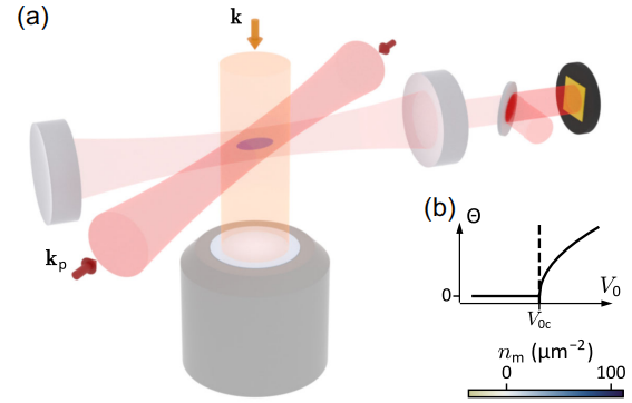 实验的设计也基于此。研究人员将一团超冷的锂原子费米气体放入腔内,再用一束侧向泵浦光去照射原子云。随着泵浦强度的升高,原子必然会更加强烈地散射光子。当系统跨越某个临界值后,原子与光场之间形成正反馈,推动更多原子往某些位置聚集。最终,原子不再均匀分布。