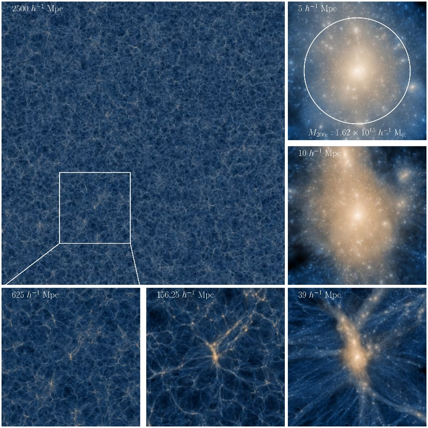 此后,Millennium-II、Millennium-XXL、日本的 Uchuu 和欧洲的欧几里得旗舰模拟(Euclid Flagship II)等项目相继推出,不断推高模拟的体量上限。