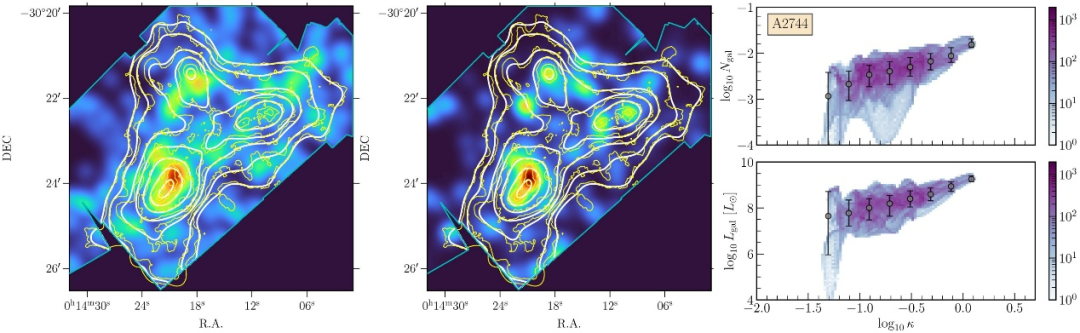 图 | A2744 与“千衍”模拟中选定的 A2744 类似物(编号 328 和 842)的星系数量和光度密度图对比(来源:http://doi.org/10.1093/mnras/stag540)