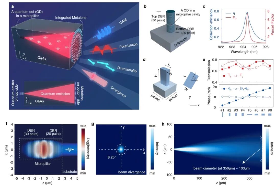 研究团队创新性地提出了量子点微腔与超透镜单片集成的器件方案,突破了片上量子光源长期以来难以兼顾单光子全优特性(纯度、亮度和不可区分性)和辐射光子态多维按需调控的关键瓶颈。具体地,研究人员在同一块 III-V 族半导体芯片的正反两面,分别构建了量子点-微柱腔单光子源和超构透镜。量子点在微柱腔中耦合并向芯片背面辐射单光子,光子经过约350 μm 厚的GaAs衬底传播后,到达器件底部的超构透镜,并在其作用下实现了辐射准直、出射方向、偏振态和轨道角动量(OAM)等维度的调控(图1a)。这一结构设计的关键在于,微柱腔输出端约2 μm直径的光场模式在传播至背面时可自然扩展至约103 μm,从而与超构透镜实现充分作用,保证高质量的光子态调控效果。该方案在近场层面有效解耦了量子点发射增强与波前调控两个过程,使单光子的高性能产生与多维光子态调控能够分别独立优化,在不牺牲腔增强性能的前提下实现功能集成。