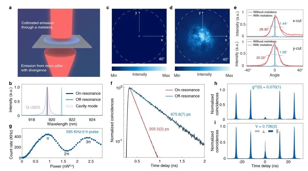 图2:超构透镜准直单光子源的表征。(a) 集成超构透镜准直单光子源的示意图。(b) 量子点与腔模式共振及失谐状态下的荧光光谱。(c) 集成超构透镜准直的单光子发射远场图像。(d) 无准直超构透镜的微柱腔单光子发射远场图像。(e) 有无集成准直超构透镜的单光子发射远场发散角对比。(f) 量子点在与微柱腔模式共振和失谐时的光子寿命,对应约 3.3 倍的自发辐射速率增强。(g) 共振荧光强度随脉冲激发激光功率的变化关系。 (h, i) π脉冲激发下单光子的HBT和HOM实验结果