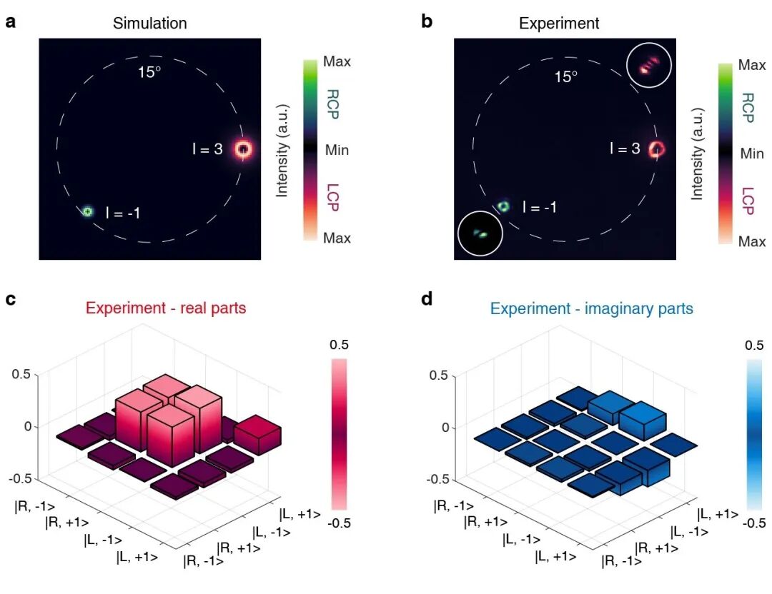 图3:利用量子点微柱腔-超构透镜集成器件产生多维度调控的单光子态。(a,b) 辐射发散角、出射方向、偏振态以及OAM等多个自由度的独立协同调控单光子态演示的模拟与实验测量结果。(c,d) 实验制备得单光子偏振-OAM纠缠态的量子态层析结果