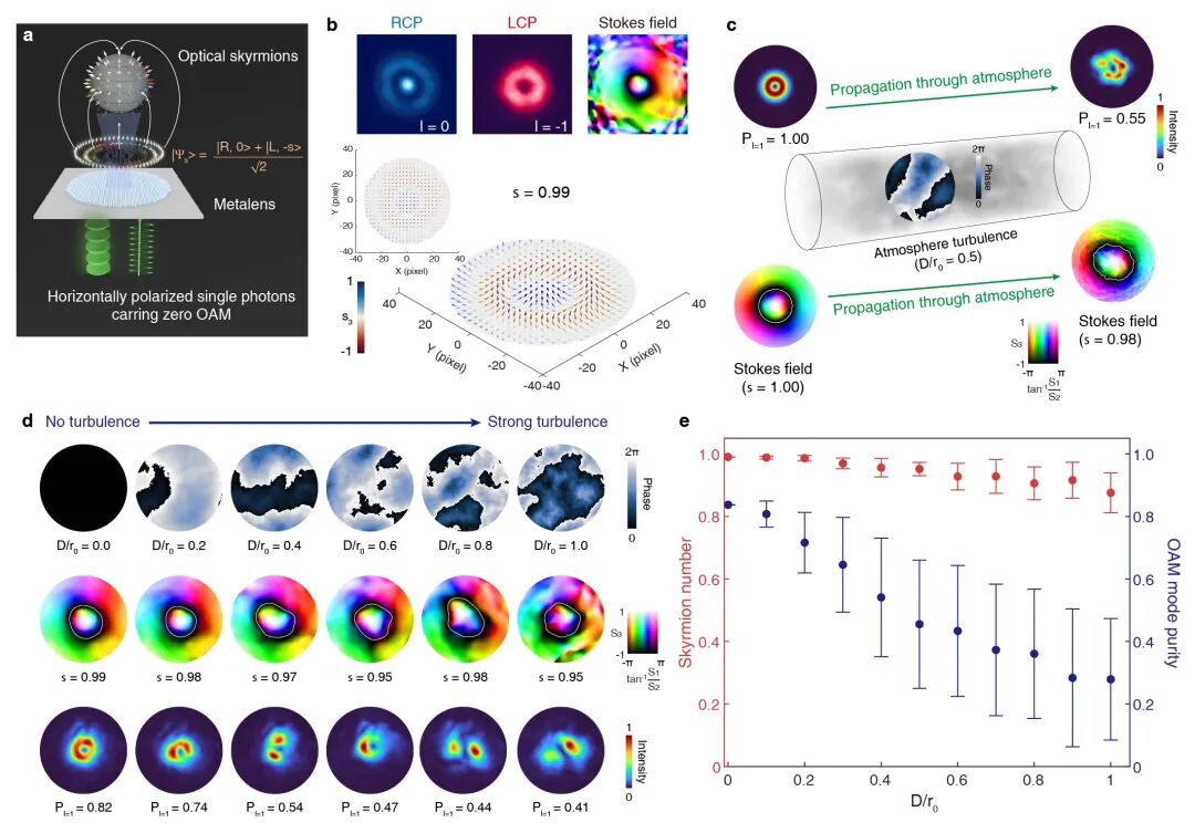 图4:利用量子点微柱腔-超构透镜集成器件产生具有拓扑稳定性的单光子斯格明子。(a) 微腔-超构透镜集成器件产生单光子斯格明子的示意图。(b) 器件生成单光子态中斯格明子数等于 1 的归一化斯托克斯矢量分布。(c) 单光子斯格明子在湍流环境中拓扑保护特性的理论模型。 尽管斯托克斯矢量场及其边界存在畸变,但仍可通过边界识别准确恢复矢量场的斯格明子数。(d) 单光子斯格明子在穿过不同强度的大气湍流后,实验测得的斯托克斯矢量场及相应的斯格明子数。(e) 携带斯格明子纹理(s=1)和 OAM(l=1)的单光子在穿过大气湍流后,斯格明子数和 OAM 模式纯度随湍流强度 D、r0的演化关系