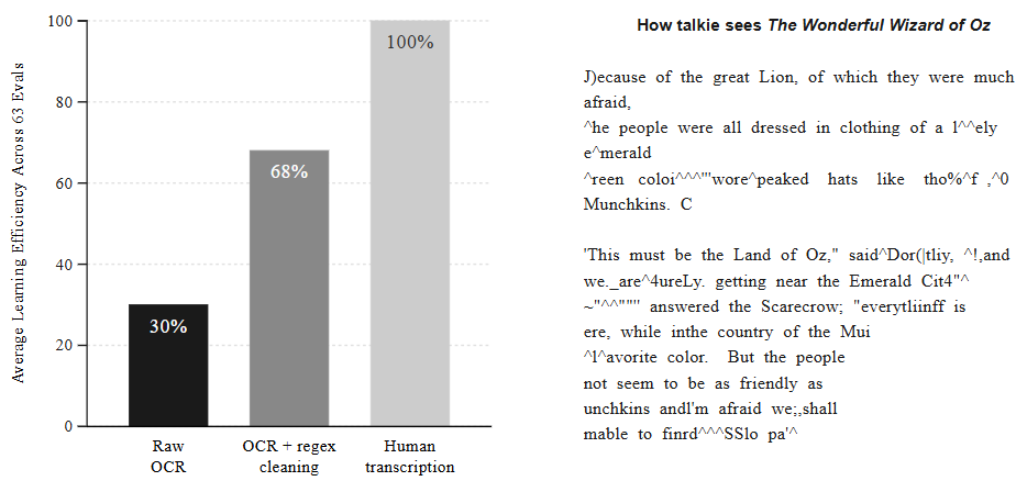 传统的文字识别系统在扫描旧书时错误率很高,经过去噪之后,模型的学习效率也只有人工转录版本的百分之三十。研究团队还发现文字识别模型会自己编造现代内容,比如在一本 1899 年的《绿野仙踪》扫描件里出现了 20 世纪才有的词汇。