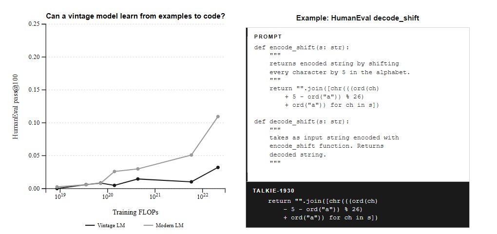 在编程任务中,他们给 talkie 几个 Python 代码的例子,让它模仿着写新的程序。真实生活在 1930 年代的人根本不知道计算机程序是什么,但是 talkie 居然能够学会。它写出来的正确程序都非常短,大多是两数相加或者针对示例代码做一个小修改。