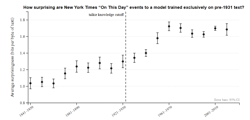 这款模型是研究语言模型行为的一个相对干净的参照系,因为作为一款时代语言模型它提供了一种新的实验方法,那就是如果把训练数据的截止时间卡在 1930 年,那么这个模型对于之后的一切历史一无所知。它不知道二战,不知道登月,不知道计算机和互联网,更不知道它自己是一种叫做 AI 的东西。