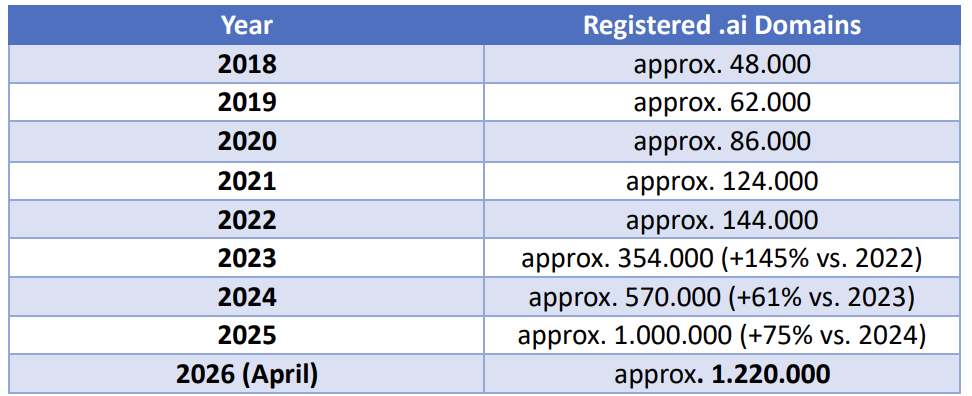 截至 2026 年 4 月,.ai 注册总数大约 110 万。Domaintechnik 的预测是 2026 年底可能达到 170 万。每天 2,000 多个新域名进入注册系统,每个域名背后是一笔进入安圭拉财政的钱。