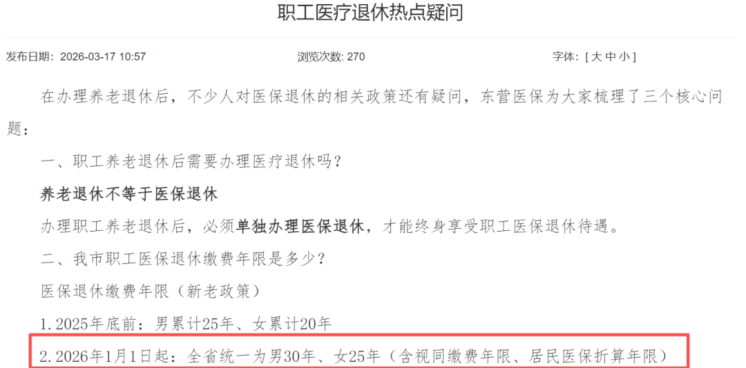 继《山东菏泽打响医保欠条“第一枪”》之后,山东医保新规,再次刷新普通老百姓(保费缴纳者)的认知下限。山东给全省职工送了一份“新年大礼”。根据山东医保新规,自2026年1月1日起,山东省统一职工基本医疗保险最低缴费年限——男职工需累计缴满30年,女职工需累计缴满25年,方可享受退休人员医保待遇。30年。你从25岁参加工作,不间断缴到55岁,正好够一个男人退休。如果中间断了几年,或者35岁才工作,对不