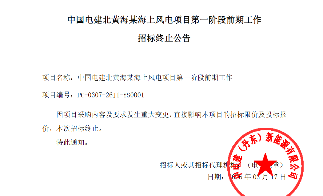 3月17日,中国电建阳光采购网发布《中国电建北黄海某海上风电项目第一阶段前期工作招标终止公告》。