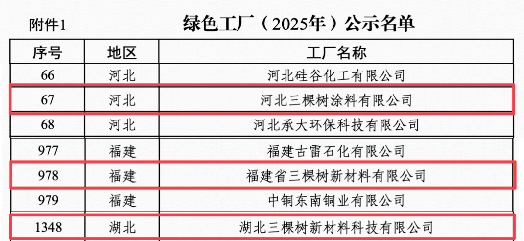 加快推动全面绿色转型,以碳达峰碳中和为牵引,协同推进降碳、减污、扩绿、增长,增强绿色发展动能。在“双碳”目标引领下,绿色转型已成为产业升级的核心命题。将低碳理念深度融入生产全流程,正成为衡量企业未来竞争力的关键标尺。3月18日,中华人民共和国工业和信息化部公布2025年度绿色制造名单,三棵树旗下河北三棵树涂料有限公司、福建省三棵树新材料有限公司、湖北三棵树新材料科技有限公司三大生产基地凭借可持续发展实践,成功获得国家级“绿色工厂”的殊荣。
