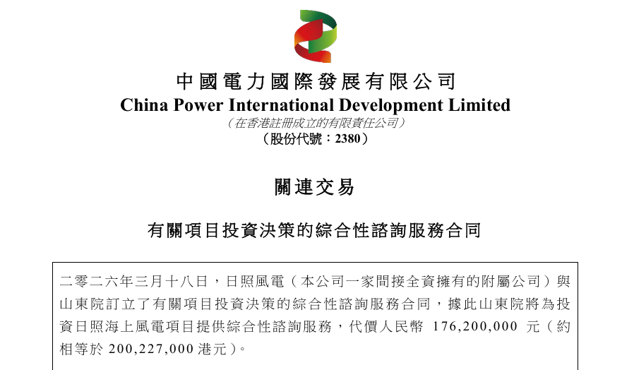 公告披露,2026年3月18日,中国电力间接全资拥有的附属公司国电投(日照)海上风电有限公司(以下简称“日照风电”)与山东电力工程咨询院有限公司(以下简称“山东院”)订立有关项目投资决策的综合性咨询服务合同,山东院将为日照海上风电项目提供综合性咨询服务,代价人民币1.76亿元。